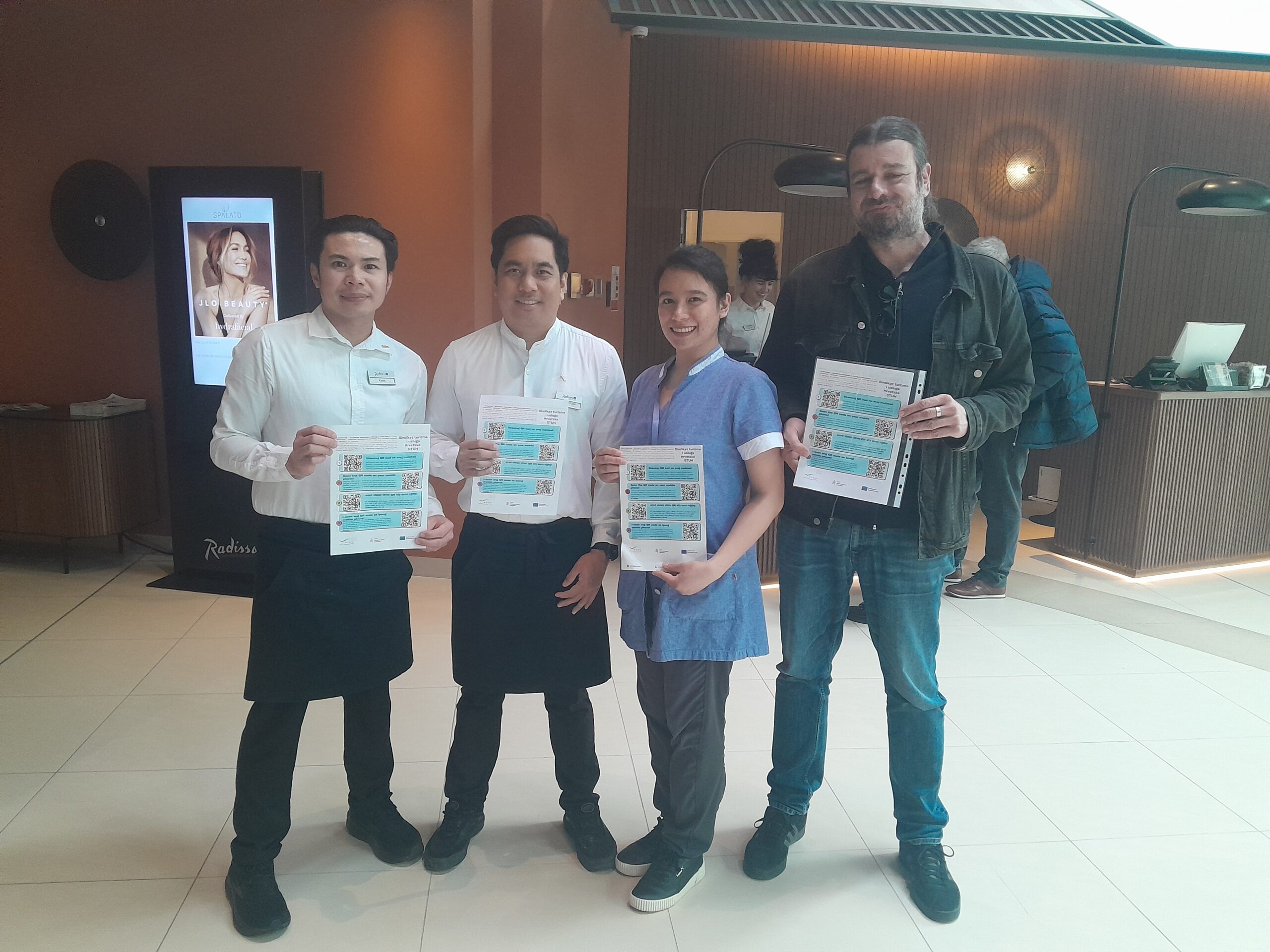 U sklopu projekta „Čovjek je ključ uspjeha u turizmu“ čiji je nositelj Sindikat turizma i usluga Hrvatske, a koji je financiran iz Europskog socijalnog fonda plus u sklopu Poziva „Jačanje kapaciteta socijalnih partnera – faza I“ dana 12.-13.2.2026. u dogovoru s poslodavcem održana je aktivnost informiranja stranih radnika zaposlenih u hotelskom kompleksu društva Radisson Blu Resort& Spa u Splitu. Strani radnici su informirani o uvjetima rada u turizmu i o ulozi Sindikata turizma i usluga Hrvatske u zaštiti i promicanju prava svih zaposlenih i članova sindikata u sektoru ugostiteljstva i turizma u RH. Tom je prigodom tajnica i voditeljica pravnih poslova Sindikata i turizma i usluga Hrvatske Sunčica Benović s regionalnim povjerenikom STUH-a Goranom Bulićem obišla lokacije na kojima rade strani radnici i informirala ih o njihovim radnim pravima i aktivnostima Sindikata koje poduzima kako bi ostvarili svoja prava u sektoru ugostiteljstva. Prilikom aktivnosti informiranja stranih radnika koji su i nakon turističke sezone nastavili raditi kod poslodavca, a s obzirom na činjenicu da hotel svoje usluge pruža cijelu godinu, uočeno je da u hotelu uz domaće radnike zaposleni i strani radnici iz Indije, Filipina, Nepala i Sjeverne Makedonije. Prilikom informiranja radnicima su podijeljeni promotivni materijali i informativni letci u kojima strani radnici mogu pronaći sve kontakte i potrebne informacije o aktivnostima Sindikata turizma i usluga Hrvatske kao i pravima koja ostvaruju temeljem sektorskog Kolektivnog ugovora ugostiteljstva čija je primjena obvezna za sve radnike zaposlene u zanimanjima u sektoru ugostiteljstva i kolektivnog ugovora koji je Sindikat turizma i usluge Hrvatske zaključio s poslodavcem, a temeljem kojega svake godine pregovara o povećanju plaća i boljih uvjeta rada za sve zaposlene radnike kod poslodavca pa tako i za strane radnike. Radnici su također pozvani na učlanjivanje u STUH kako bi kao članovi sindikata ostvarili ostala prava.